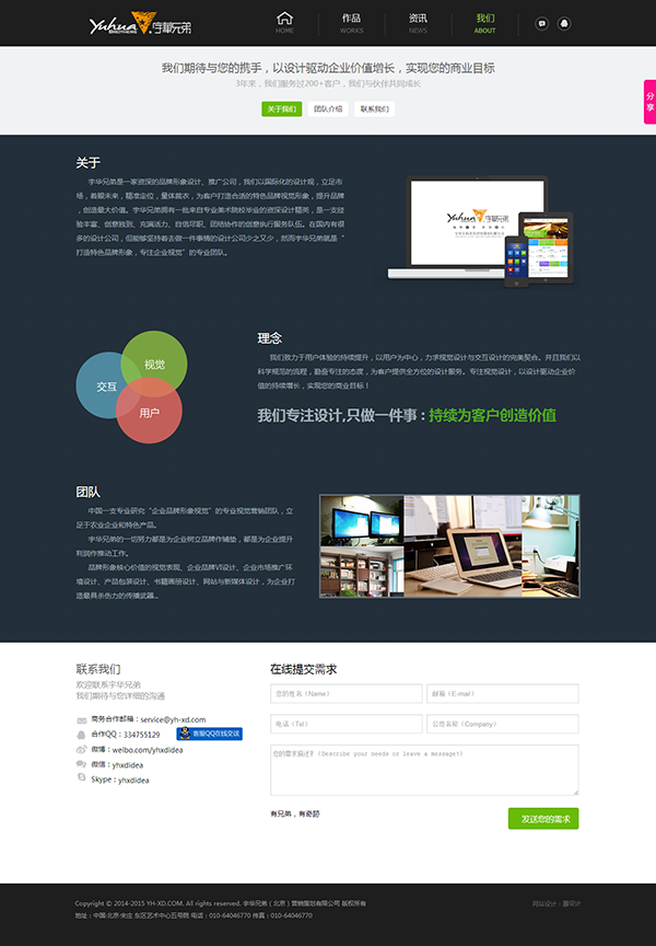 宇华兄弟是一家资深的品牌形象设计、推广公司,我们以国际化的设计观,立足市场,着眼未来,精准定位,量体裁衣,为客户打造合适的特色品牌视觉形象,提升品牌,创造最大价值。宇华兄弟拥有一批来自专业美术院校毕业的资深设计精英,是一支经验丰富、创意独到、充满活力、自信尽职、团结协作的创意执行服务队伍。在国内有很多的设计公司,但能够坚持着去做一件事情的设计公司少之又少,然而宇华兄弟就是“打造特色品牌形象,专注企业视觉”的专业团队。